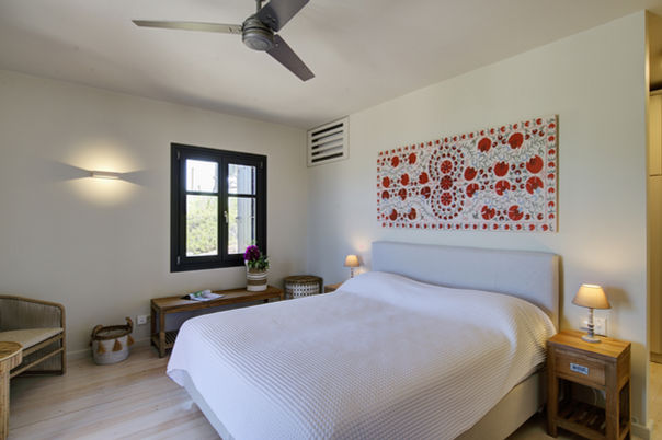 1 Master bedroom with en-suite shower room, TV, walk-in closet, A/C, ceiling fan & sea/sunset view access to a private veranda