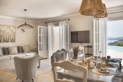 Embrace authentic Corfian architecture and modern luxury at this villa in Corfu. Unwind with an infinity pool, sun-soaked balconies, contemporary art, and Venetian heritage.