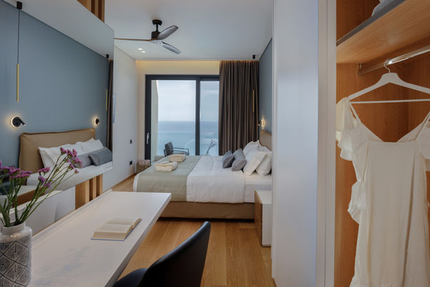 1 Master Suite, with a double bedroom, large wardrobe, en-suite bathroom with a bath tap, separate shower space, & spacious private terrace with sea view
