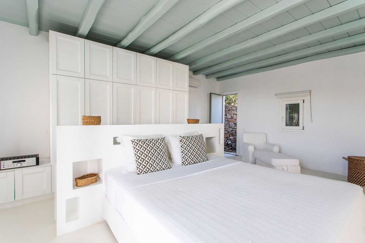 The villa’s graceful design is an emblematic sample of traditional Cycladic aesthetics with wooden ceiling bedrooms on the inside and the stone walls creating a dazzling contrast against the timeless Aegean white on the outside. The villa also features an enchanting terrace with a private pool and lounge areas that display overwhelming views.