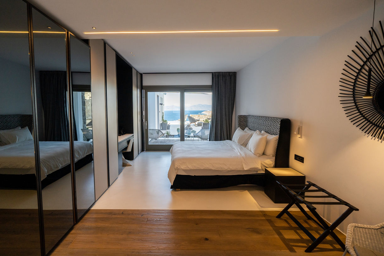 The interior area of this villa in Mykonos boasts nine master suites, each with a double bed complete with its own en-suite bathroom. The spacious living areas are thoughtfully designed to exude elegance and sophistication, making it the perfect place to relax and unwind. The fully equipped kitchen is perfect for preparing meals with ease, with everything you need for creating delicious meals for your family and friends.