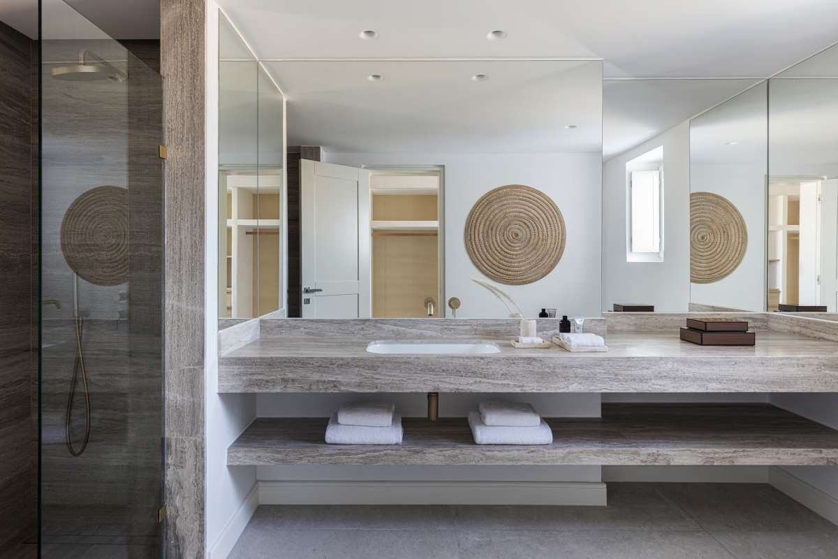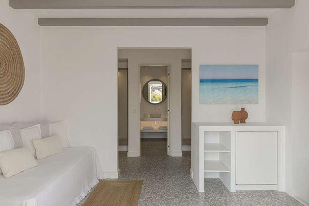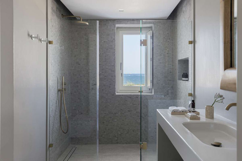 The Lower Level of the main house features two luxurious sea-view bedrooms designed for comfort and privacy. The first bedroom offers a king-size bed, a bedside stool, large windows with direct sea and sunset views, a lounge chair with a side table, and a private veranda. It includes a His & Hers walk-in closet and an en-suite bathroom with a large sea-view shower, Naxos Apothecary amenities, hair dryer, A/C, and Wi-Fi. The second bedroom also features a king-size bed, a bedside stool, expansive sea-view windows, a vanity table with chair, a lounge chair with side table, and a private veranda. His & Hers wardrobes provide ample storage, and the en-suite bathroom includes twin vanity sinks, a separate toilet, Naxos Apothecary amenities, hair dryer, A/C, and Wi-Fi. Both rooms offer elegant, serene spaces with stunning Aegean views.