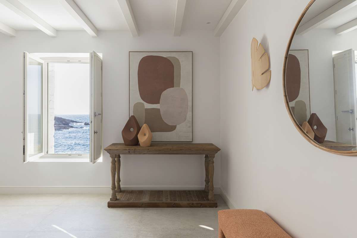 The villa features six spacious bedrooms and generous living areas designed to showcase the surrounding seascape. The main living space is framed by three large windows with uninterrupted sea and sunset views and includes a comfortable sitting area for up to 14 guests, a marble dining table for 10, and direct access to the infinity swimming pool. A film projector and audio system enhance the space, making it perfect for both relaxation and entertainment.