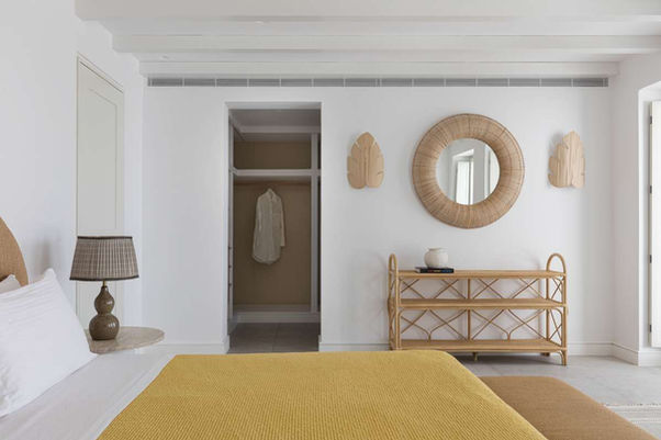 The External Bedrooms offer stylish, private retreats with stunning sea, sunset, and pool views. The first bedroom features a king-size bed with a bedside stool, a sofa, a desk with a chair, a breakfast table for two, and a small fridge. Large windows overlook the pool and sea, while a His & Hers walk-in closet with full-length mirrors provides ample storage. The en-suite bathroom includes a spacious shower, separate toilet, Naxos Apothecary amenities, hair dryer, A/C, and Wi-Fi. The second bedroom offers a king-size bed, a vanity table with a chair, and large windows framing direct sea and sunset views. Guests enjoy a private seafront balcony with an outdoor lounge, His & Hers wardrobes, and an en-suite bathroom with a shower, large countertop, Naxos Apothecary amenities, hair dryer, A/C, and Wi-Fi. Both rooms combine elegance, comfort, and breathtaking vistas.