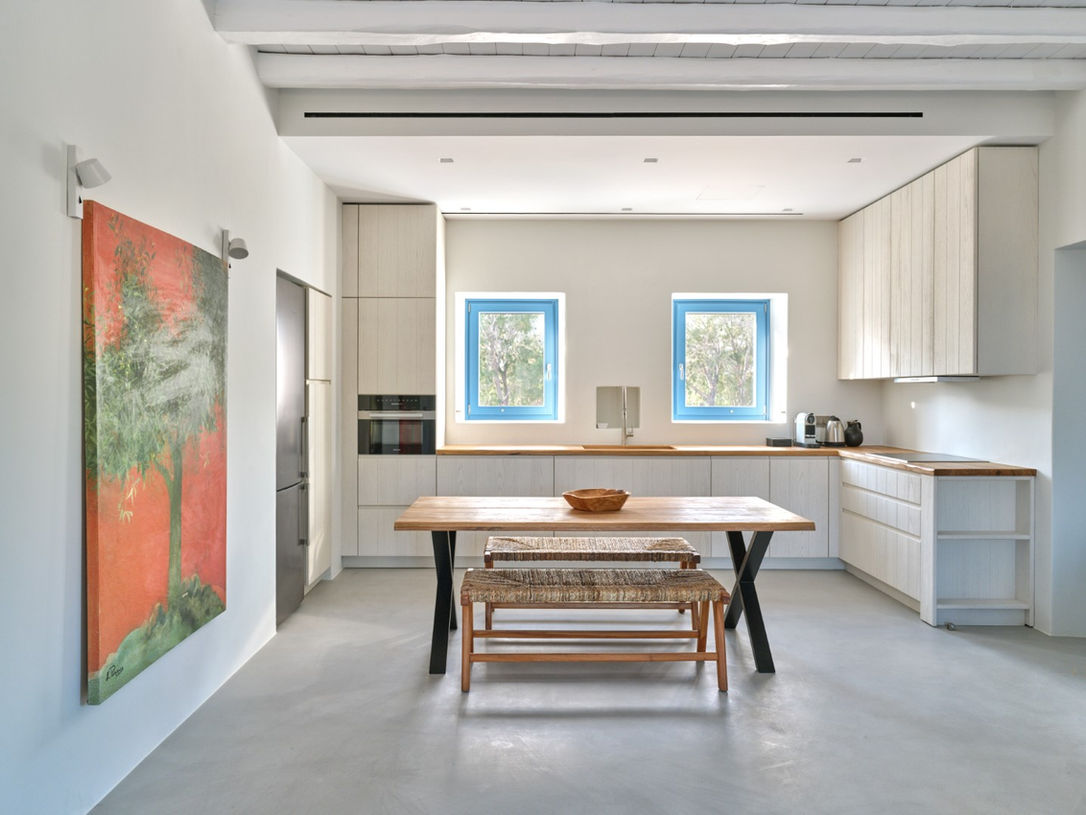 The 182 sqm Main House welcomes guests through an impressive wooden entrance into a bright, open-plan living space designed to embrace its stunning surroundings. Floor-to-ceiling sliding glass doors on both sides reveal panoramic views of the infinity pool, lush botanical gardens, and the islet of Agia Kali in the bay of Naoussa. The elegant living area features a comfortable lounge with a fireplace and a large dining table for up to twelve guests. A fully equipped traditional kitchen opens to an additional dining area, ideal for casual meals. The Main House also offers two master en-suite bedrooms, a guest WC, and a utility room, with seamless access to the front veranda featuring poolside lounging and outdoor dining areas.