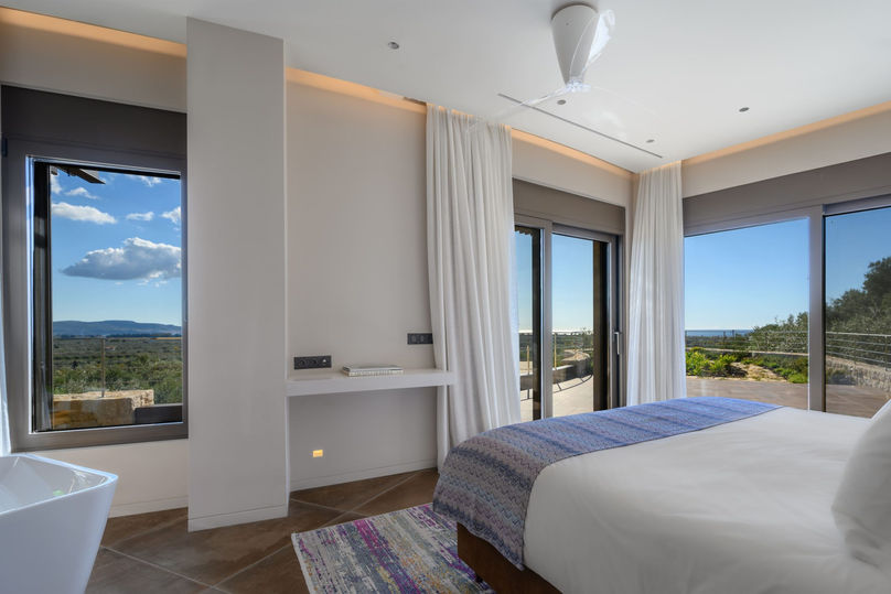 Set in one of the most breathtaking locations near Pylos, within the prestigious Costa Navarino area, this exceptional villa offers uninterrupted views of the Ionian Sea and the Bay of Navarino, overlooking four world-class golf courses. The property spans one idyllic acre, surrounded by 250 olive trees, fragrant herbs, colorful flowers, and private shaded garden retreats, creating a serene and secluded atmosphere. Its innovative moon-shaped architecture blends harmoniously with the natural landscape, while warm tones, elegant furnishings, and thoughtfully designed interiors provide comfort, privacy, and understated luxury. Wake up and step directly from your bedroom to the infinity pool for a refreshing morning swim. As the sun sets, gather for dinner beside the outdoor fireplace, embraced by the calm sea breeze and the beauty of nature all around you.