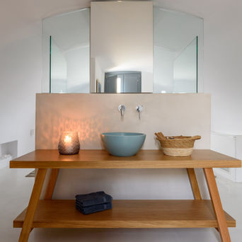 The main house is beautifully decorated with an elegant minimalistic style that brings the hues of nature into the living rooms, dining room, and fully-equipped kitchen. The stone-built underground cellar offers a great space to hold a wine-tasting event. It’s an excellent way to explore the flavors of the Santorini vineyards that surround the estate.